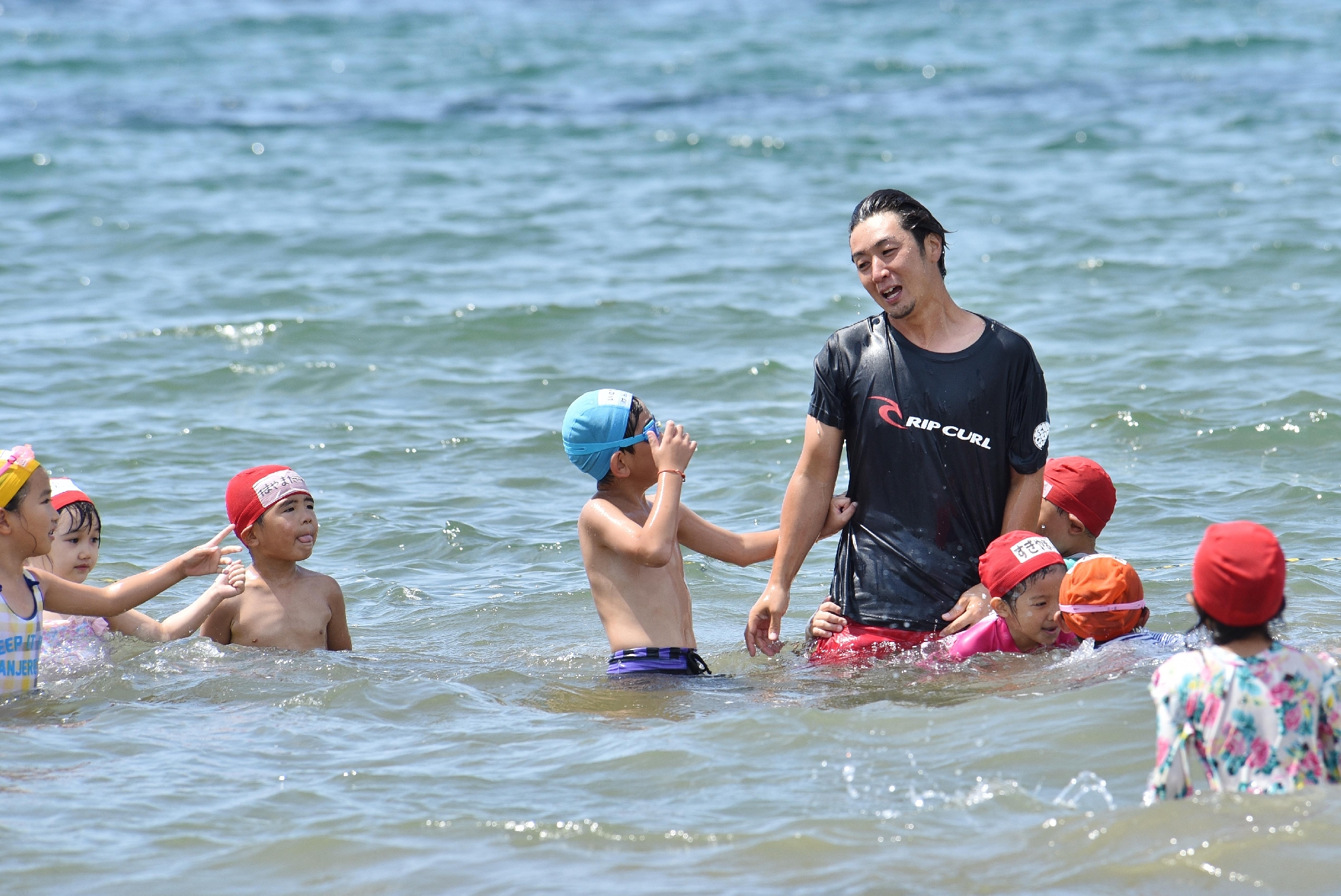 We have weekly swimming class with our PE teacher in our indoor heated swimming pool throughout a year from Nensho (K1). Having opportunities actively involved with water from early childhood to dispel the fears of water and to make the basis of strong body, as well as nurturing a strong heart to challenge with all the thing they may face. With children who were fearing water at first, gradually becoming able to put the face in the water, then dive under the water, and as going through the growing process, they begin to show bright happy faces. We are targeting to be able to float, and to swim by the time of graduation. During mid summer, we have pools outside and enjoy playing with water under the sun.