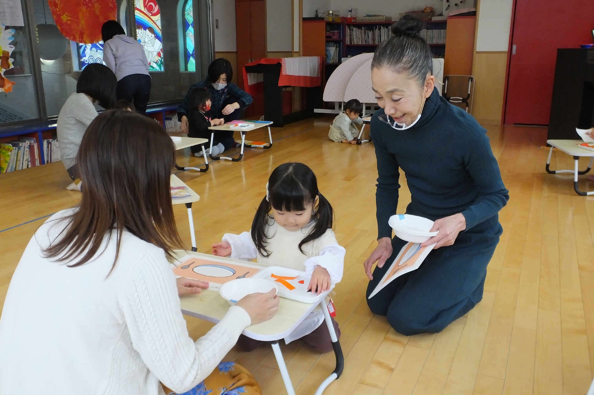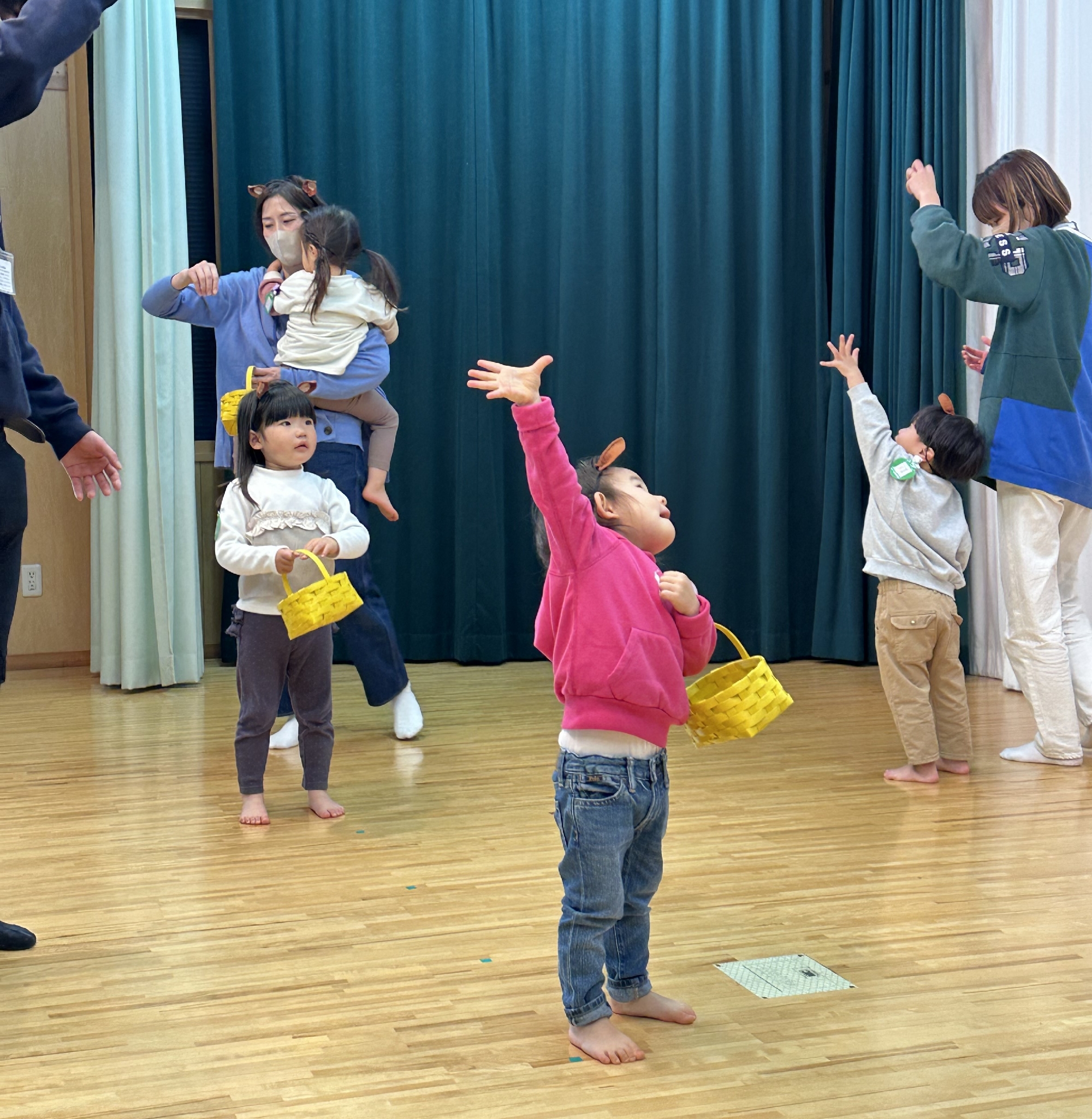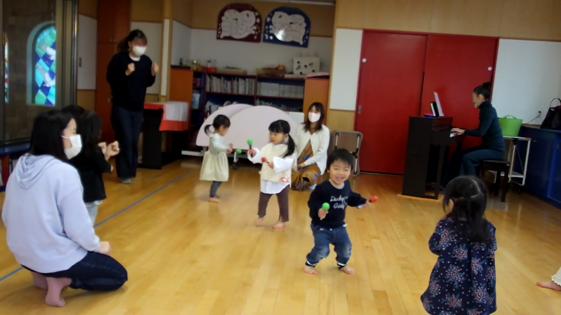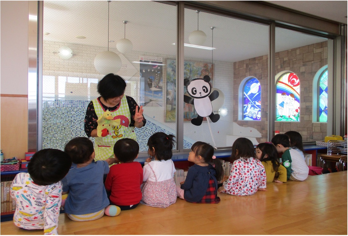 朝の会、季節に応じた歌、造形絵画製作、紙芝居、絵本の読み聞かせ、親子遊び 他 Morning session,Song, Art, Picture story show, Story time (reading picture book), Parent-Child Play, etc |